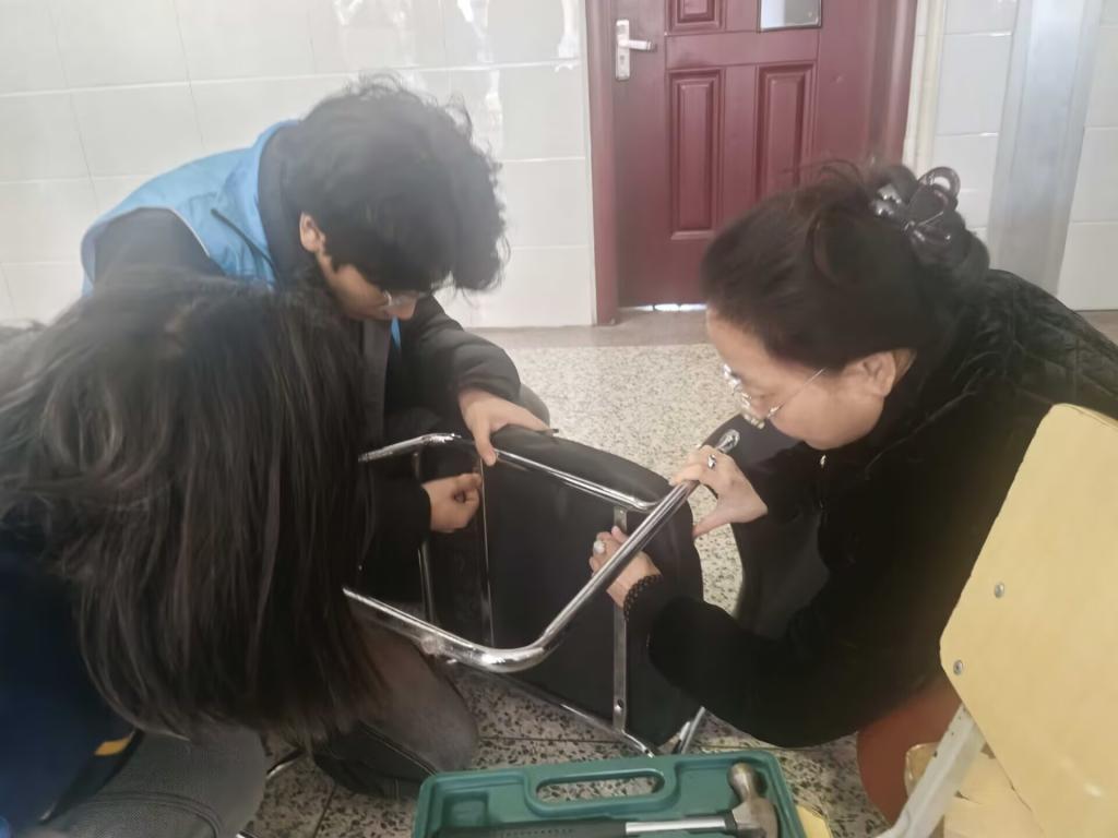 活动现场,党员同志率先垂范、各司其职,成为维修工作的核心力量。党员同志们有的负责精准排查破损点位,有的专注专业维修操作,有的负责整理修复后的座椅,凭借耐心和责任心逐一攻克,确保每一把修好的椅子都能安全使用。