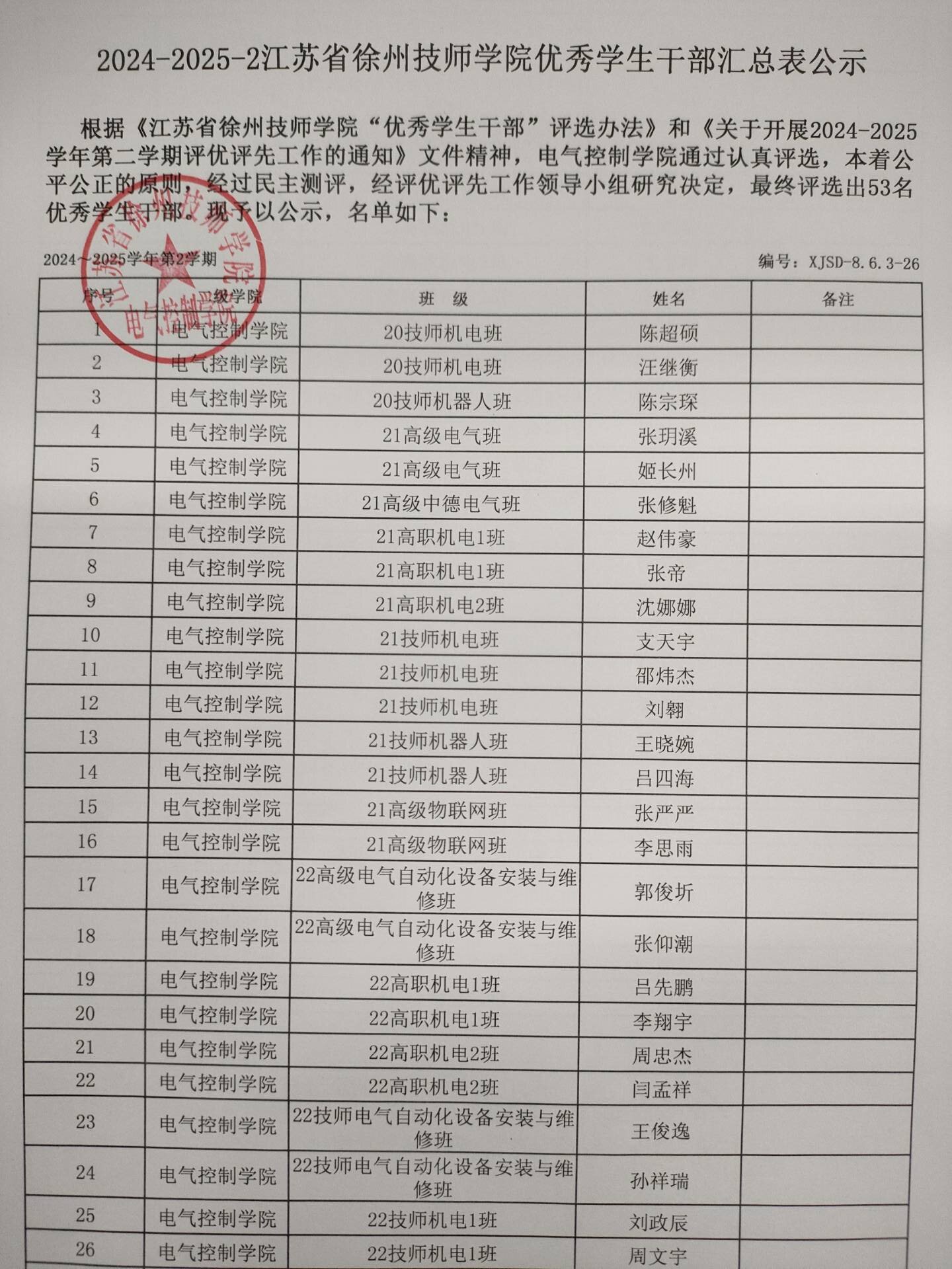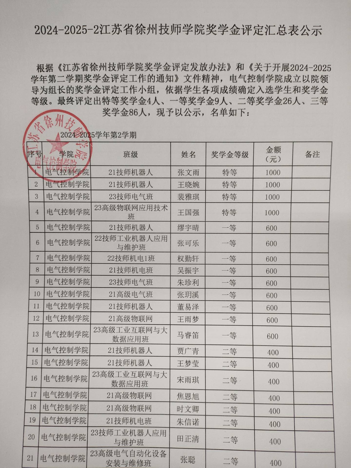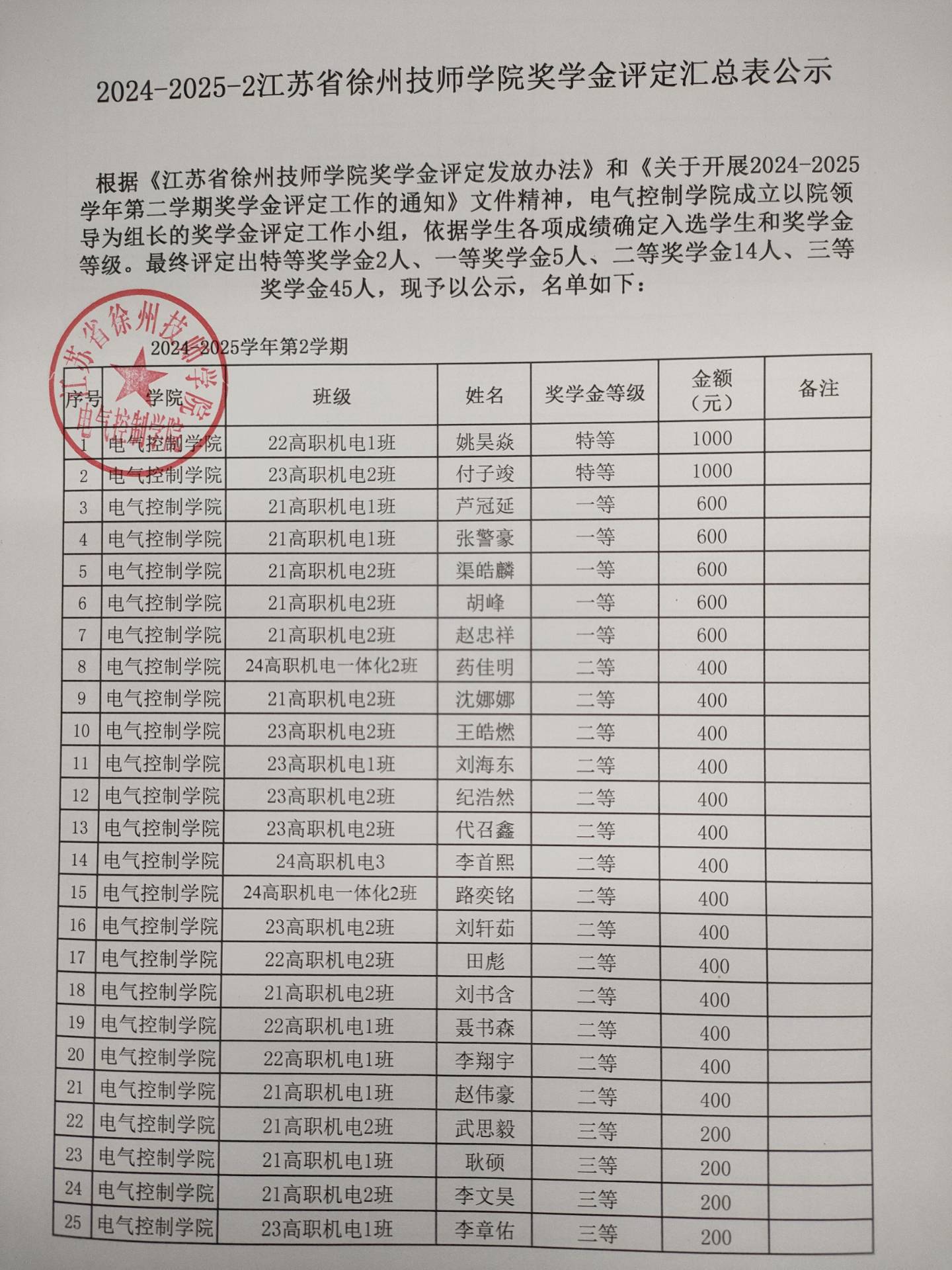 2024-2025学年第二学期电气控制学院评优评先、奖学金、劳动之星评定公示
