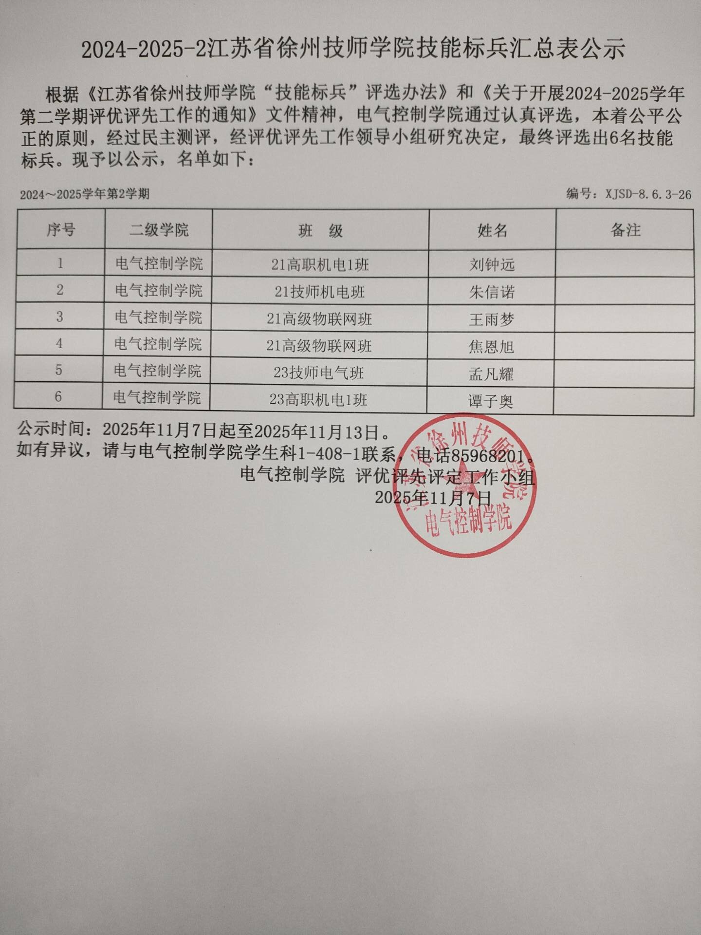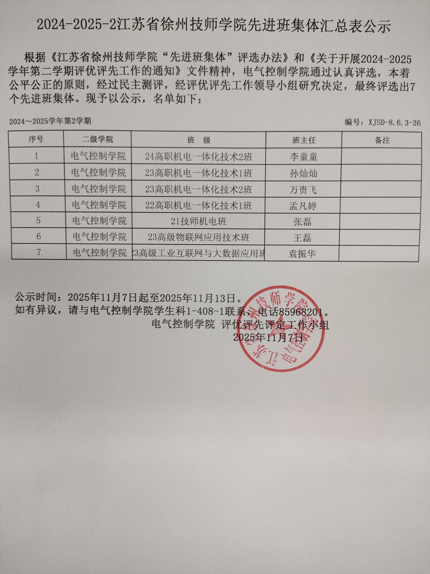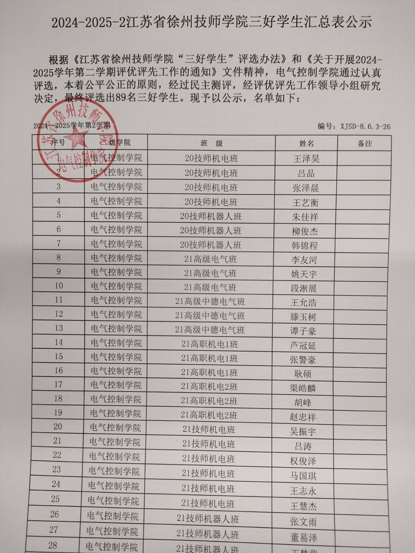 2024-2025学年第二学期电气控制学院评优评先、奖学金、劳动之星评定公示